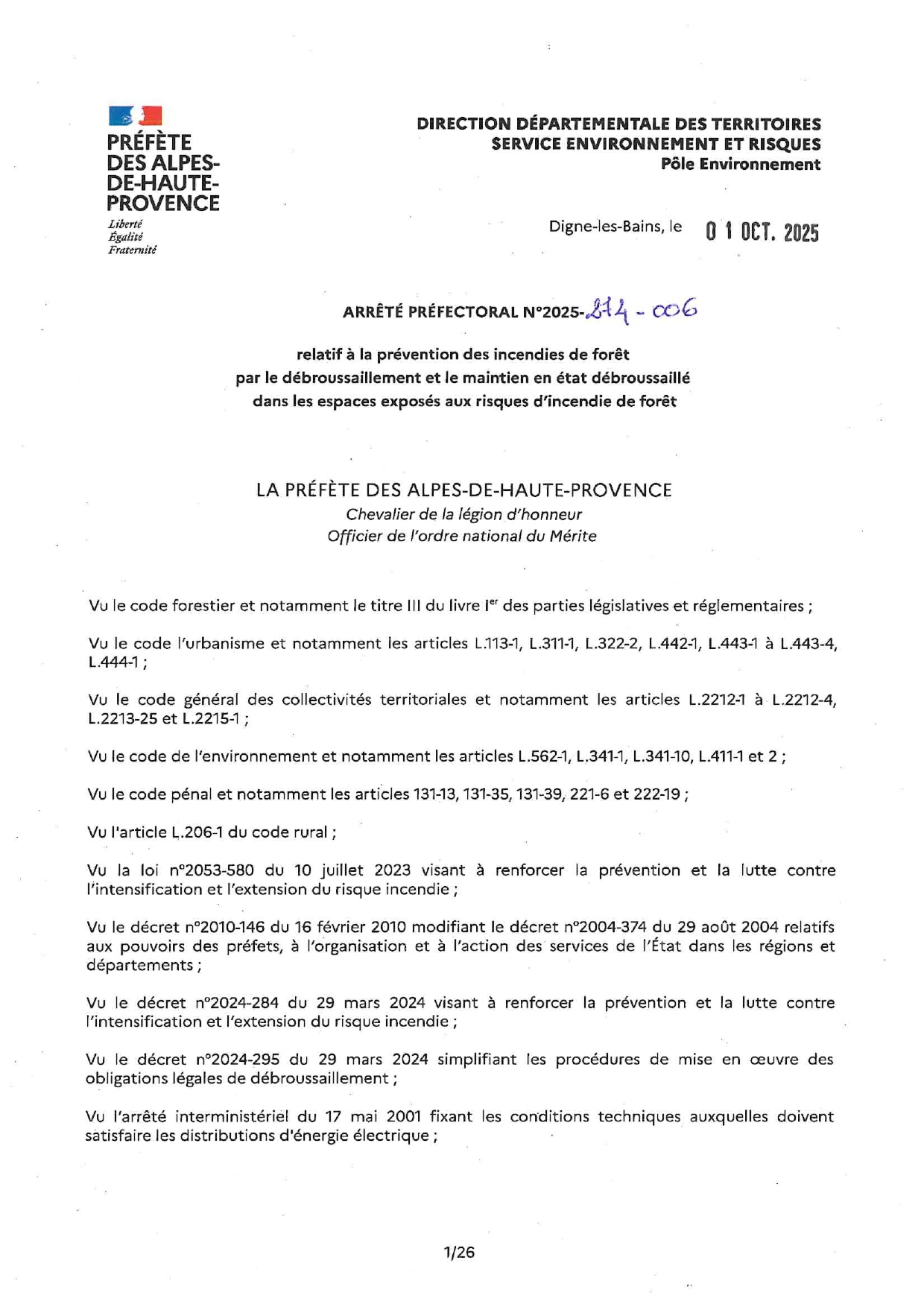 ARRÊTÉ PRÉFECTORAL N° 2025-274-006 RELATIF A LA MISE EN ŒUVRE DES OBLIGATIONS LÉGALES DE DEBROUSSAILLEMENT