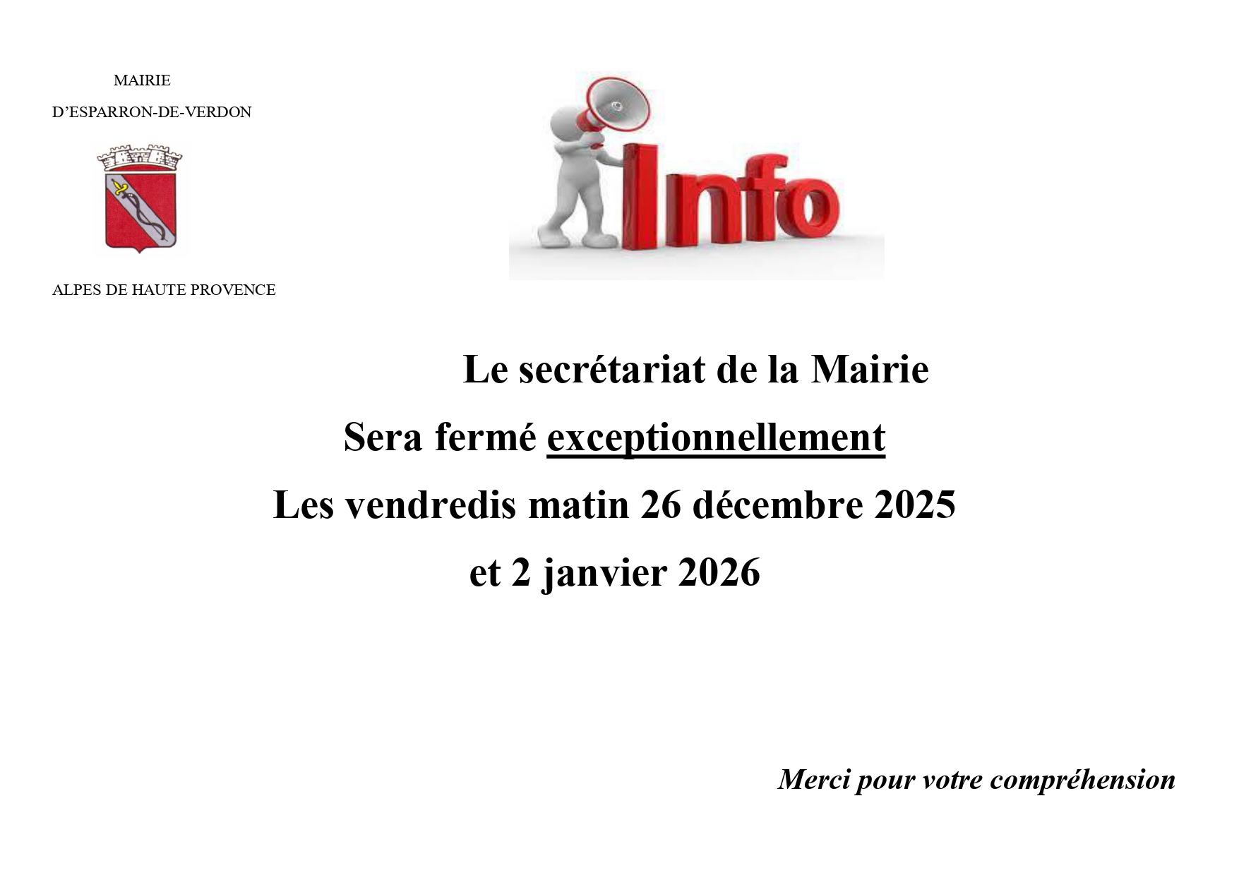 FERMETURE EXCEPTIONNELLE DE LA MAIRIE LES VENDREDIS 26 DÉCEMBRE 2025 ET 2 JANVIER 2026