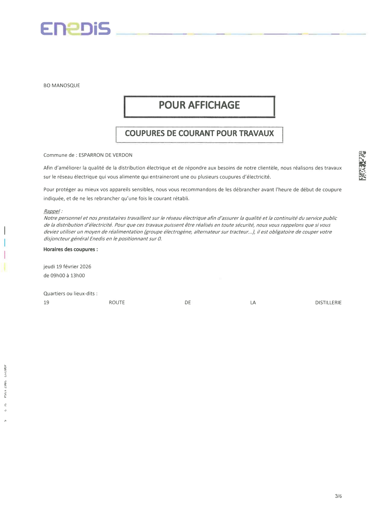 COUPURES DE COURANT POUR TRAVAUX ENEDIS JEUDI 19 FÉVRIER 2026 DE 9H00 A 13H00 – QUARTIER 19 ROUTE DE LA DISTILLERIE