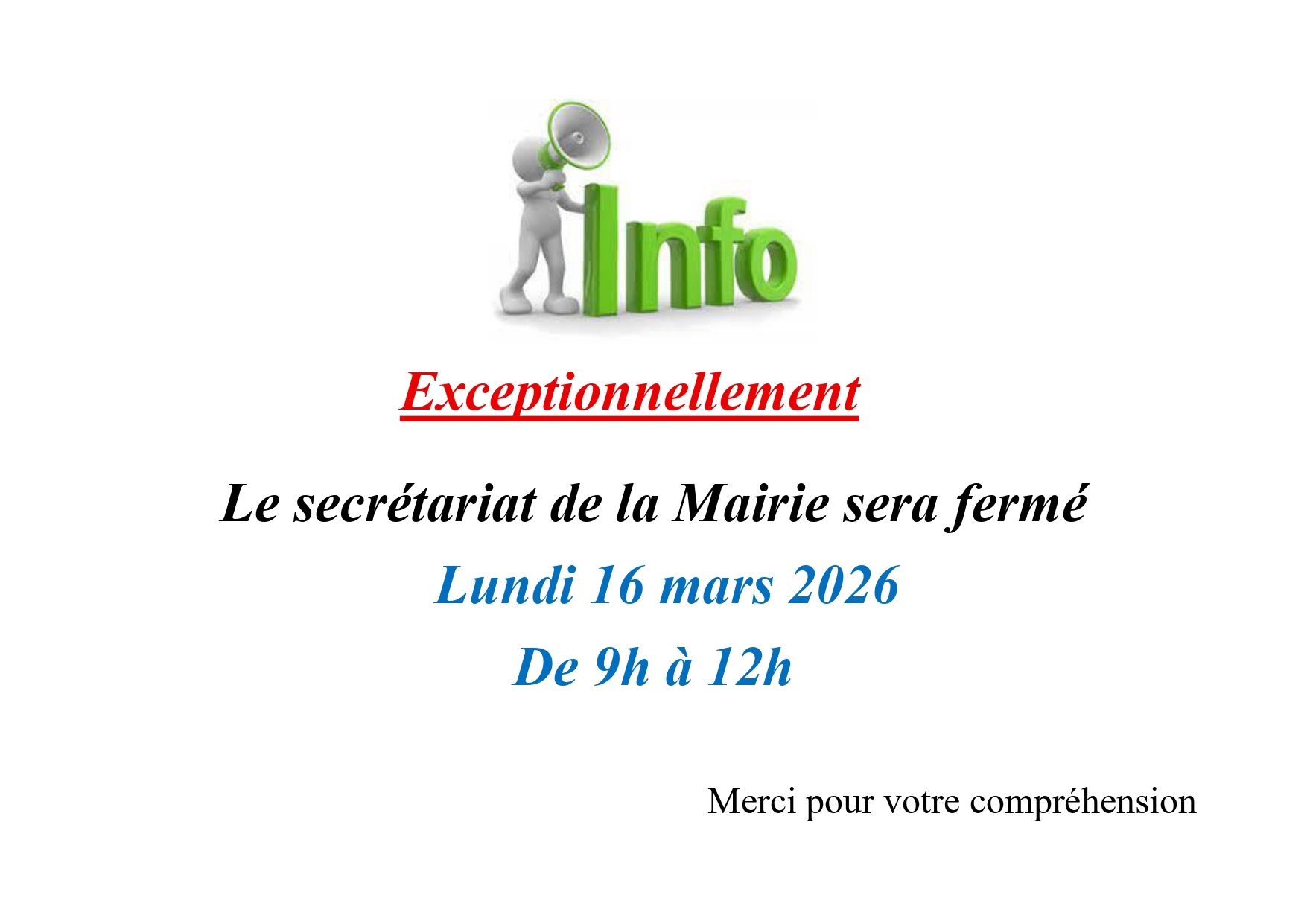 FERMETURE EXCEPTIONNELLE DU SECRÉTARIAT DE LA MAIRIE LE LUNDI 16 MARS 2026 DE 9H00 A 12H00