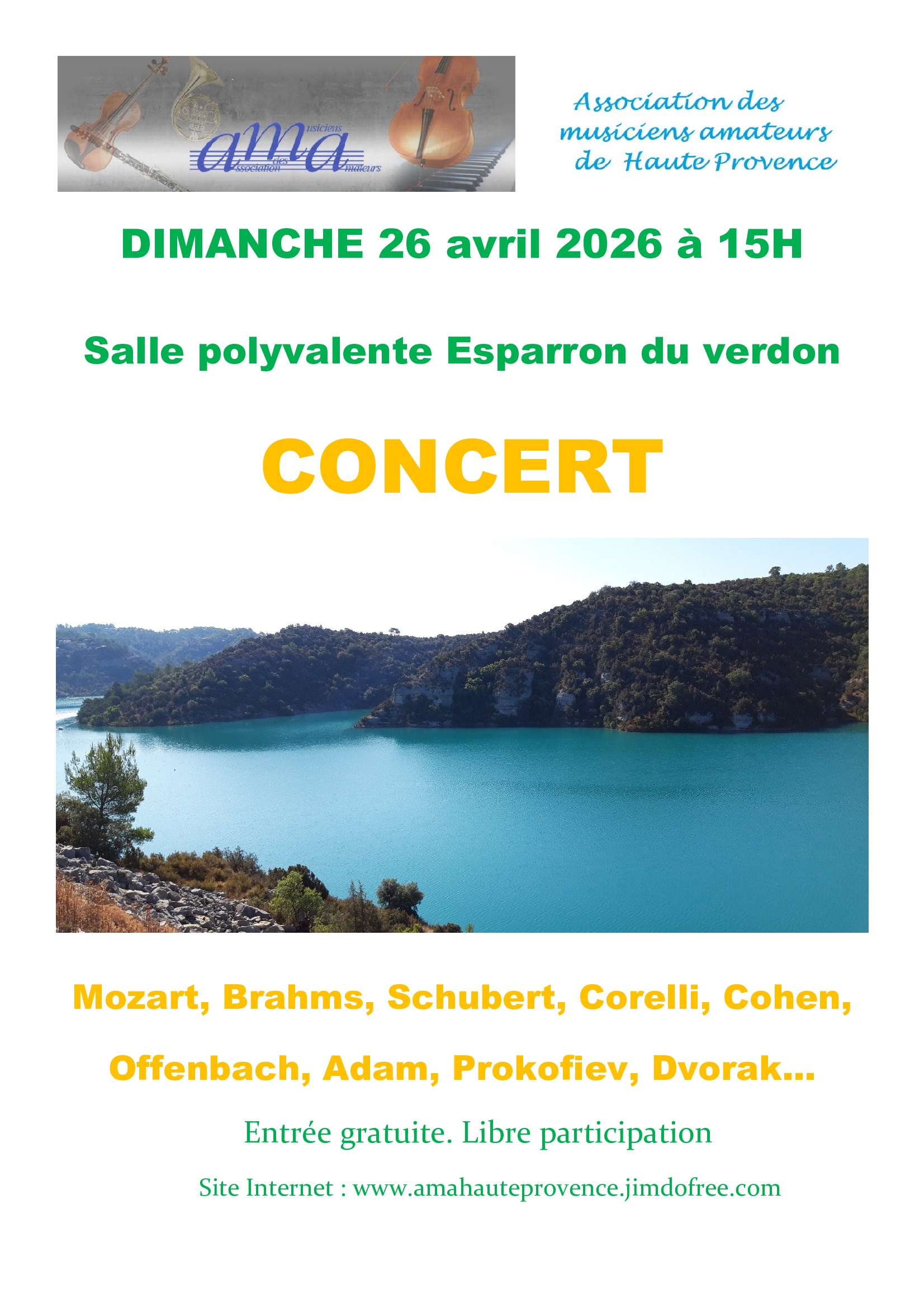 L’association des musiciens amateurs de Haute Provence organise un concert de musique classique le dimanche 26 avril 2026 à 15h00 dans la salle polyvalente d’Esparron-de-Verdon – Entrée gratuite – Libre participation
