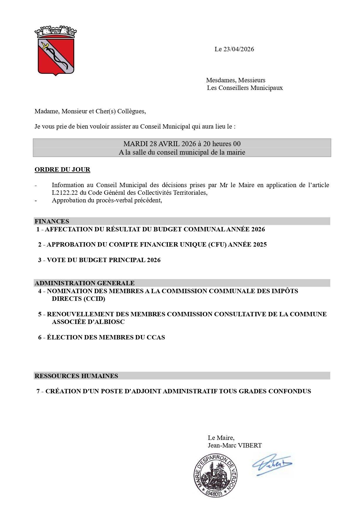 ORDRE DU JOUR DU CONSEIL MUNICIPAL DU MARDI 28 AVRIL 2026 A 20H00