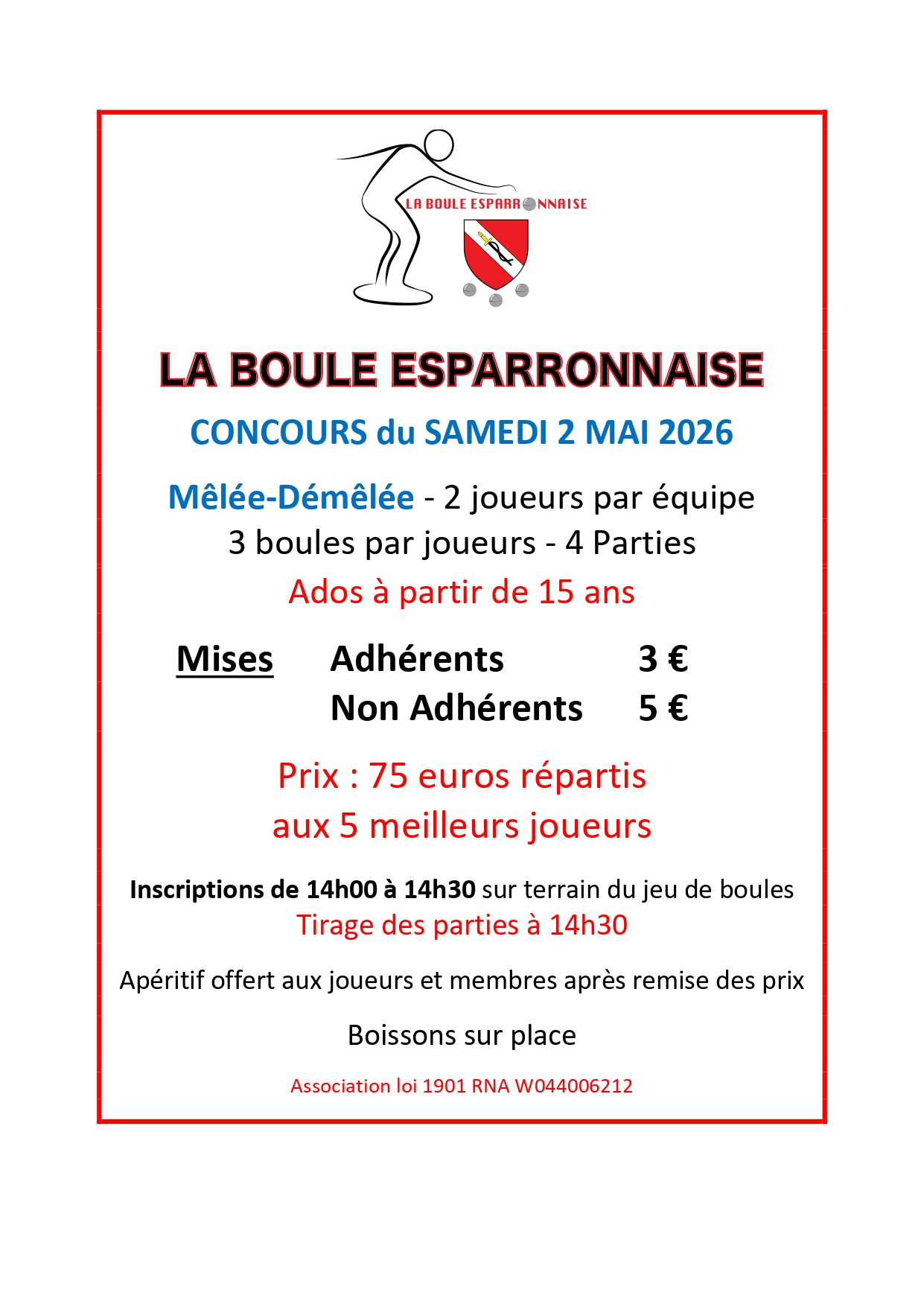 CONCOURS DE LA BOULE ESPARRONNAISE LE SAMEDI 02 MAI 2026 A PARTIR DE 14H00 SUR LE TERRAIN DU JEU DE BOULES