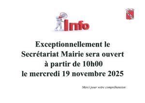 LE SECRÉTARIAT MAIRIE SERA OUVERT EXCEPTIONNELLEMENT A PARTIR DE 10H00 LE MERCREDI 19 NOVEMBRE 2025