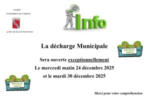 OUVERTURE EXCEPTIONNELLE DE LA DÉCHARGE MUNICIPALE LE MERCREDI MATIN 24 DÉCEMBRE 2025 ET LE MARDI 30 DÉCEMBRE 2025