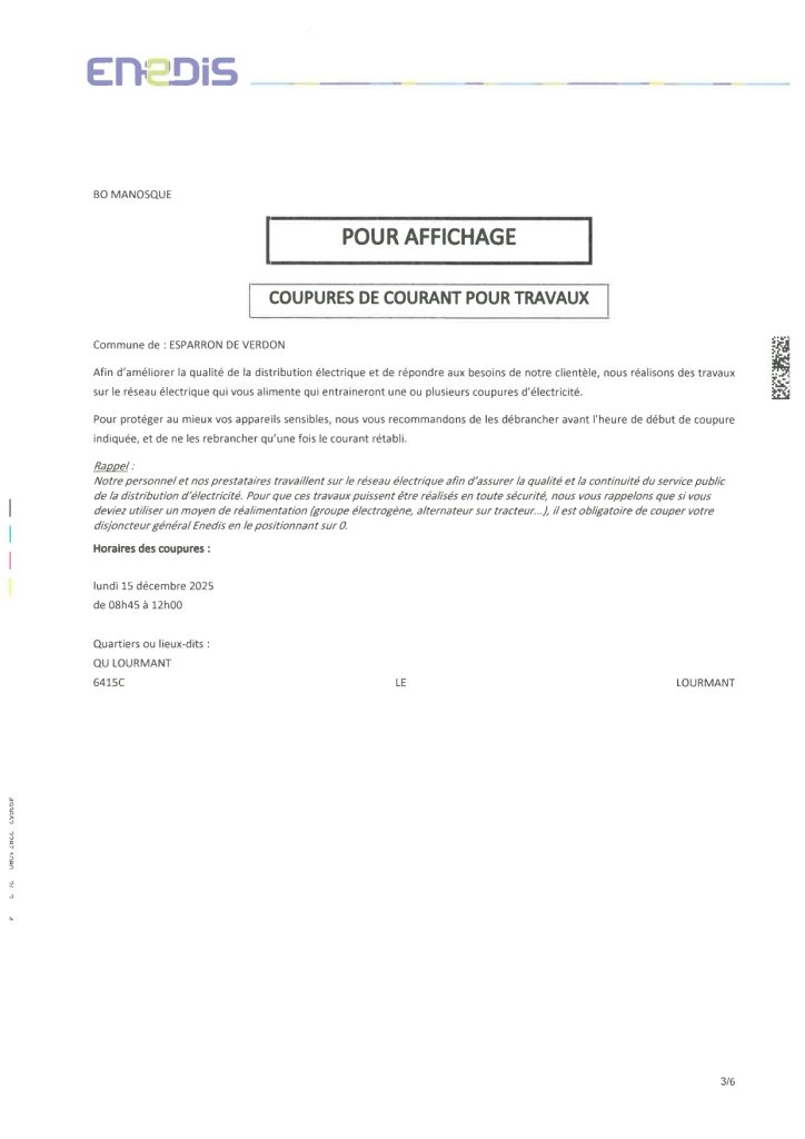 COUPURES DE COURANT POUR TRAVAUX LE LUNDI 15 DÉCEMBRE 2025 De 8H45…