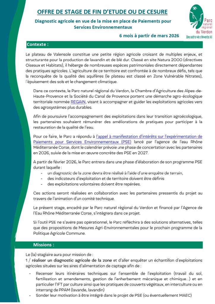 OFFRE DE STAGE DE FIN D’ÉTUDE OU DE CÉSURE AU PARC NATUREL RÉGIONAL DU VERDON