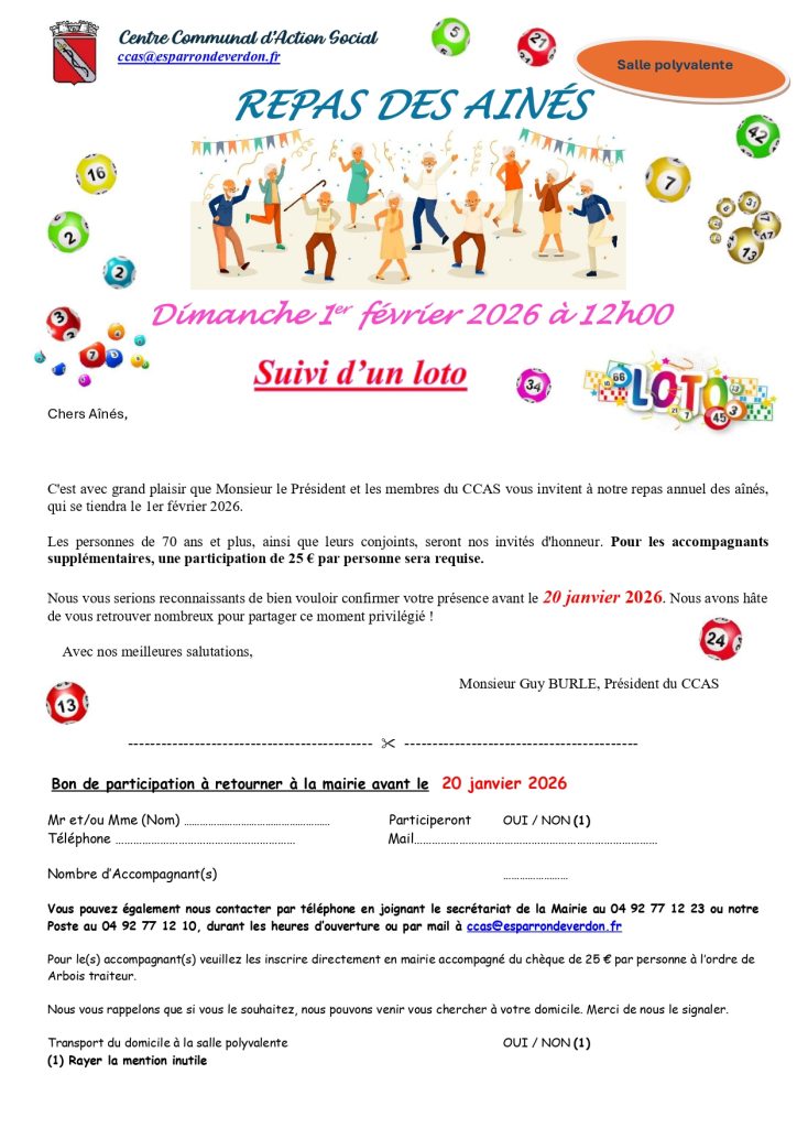 INSCRIPTION REPAS DES AINES POUR LE DIMANCHE 1ER FÉVRIER 2026 A 12H00 A LA SALLE POLYVALENTE