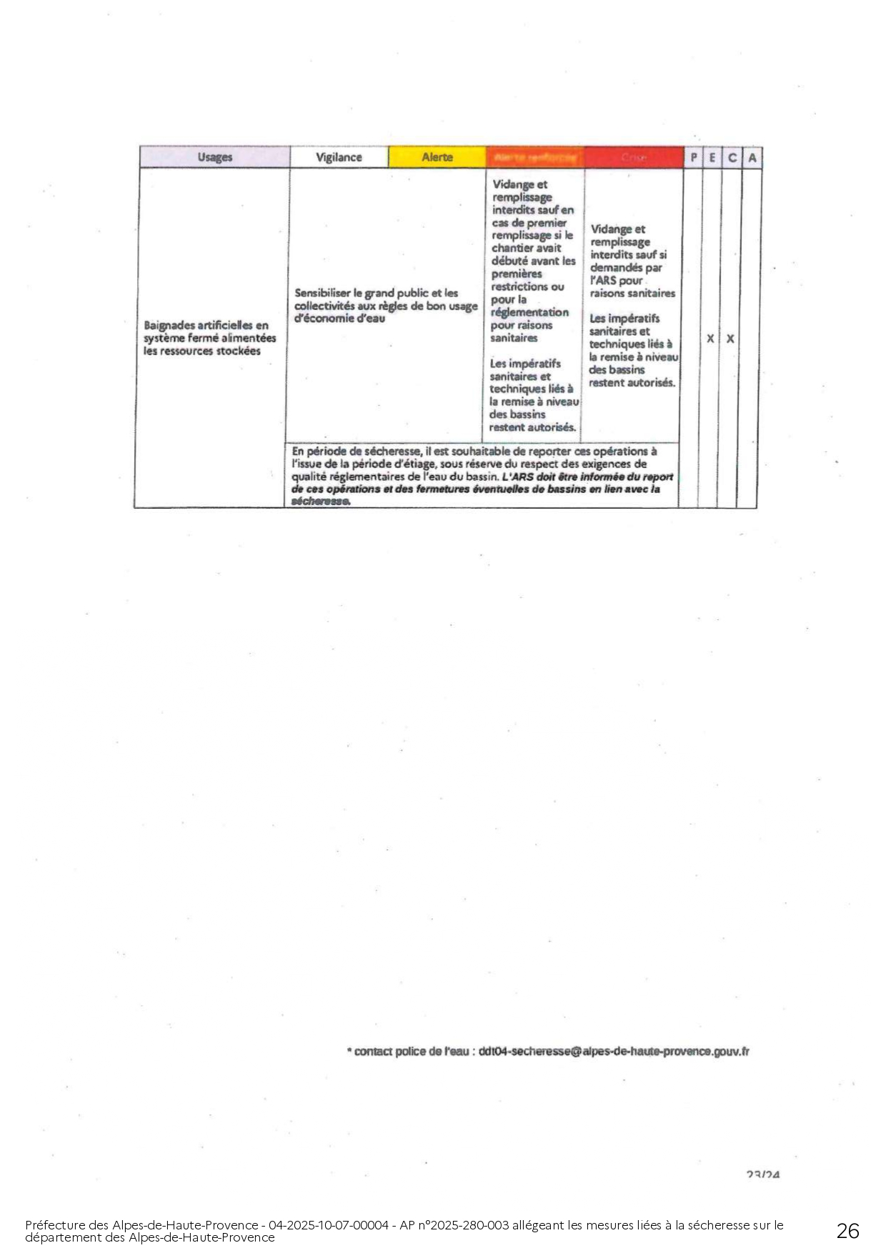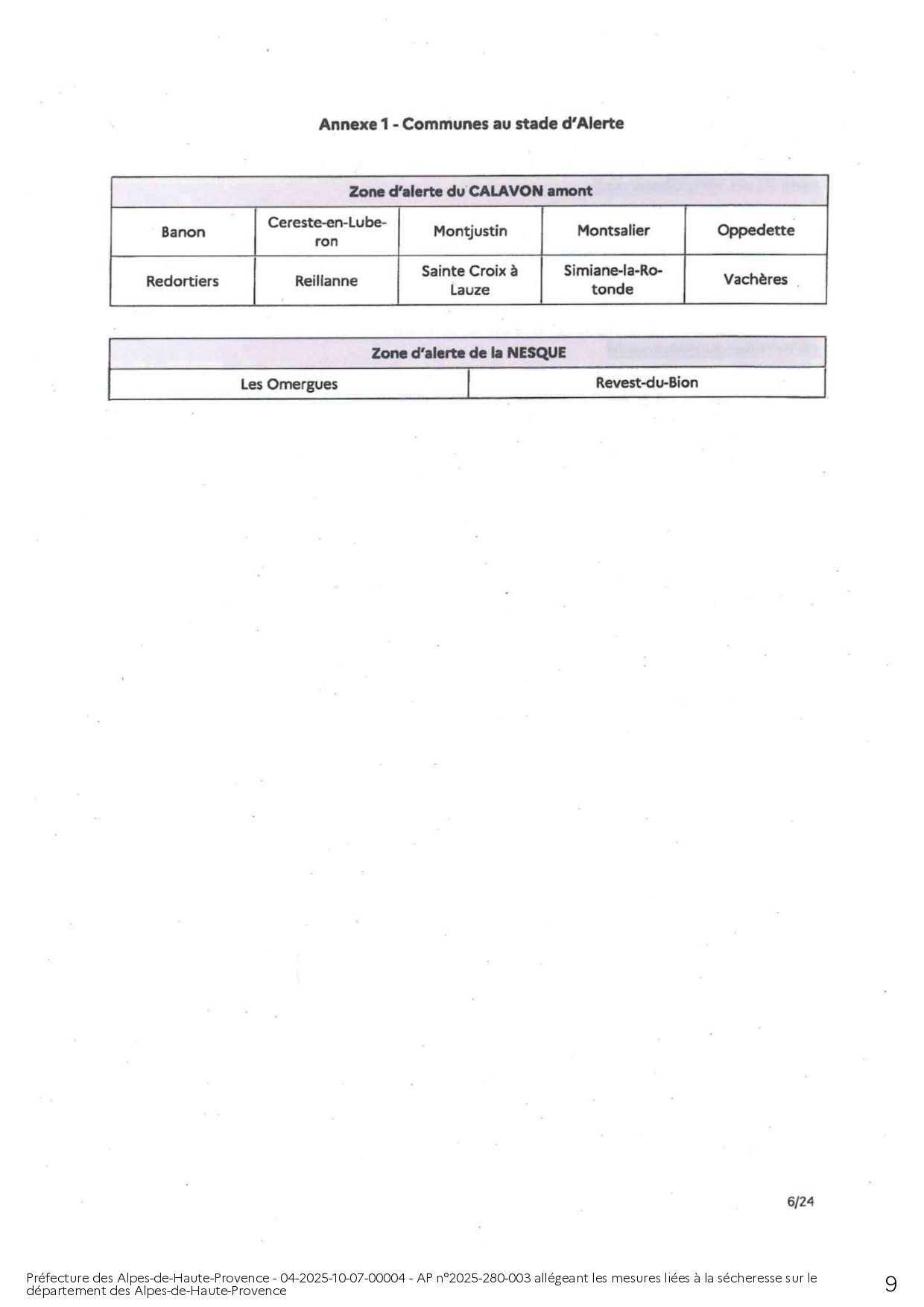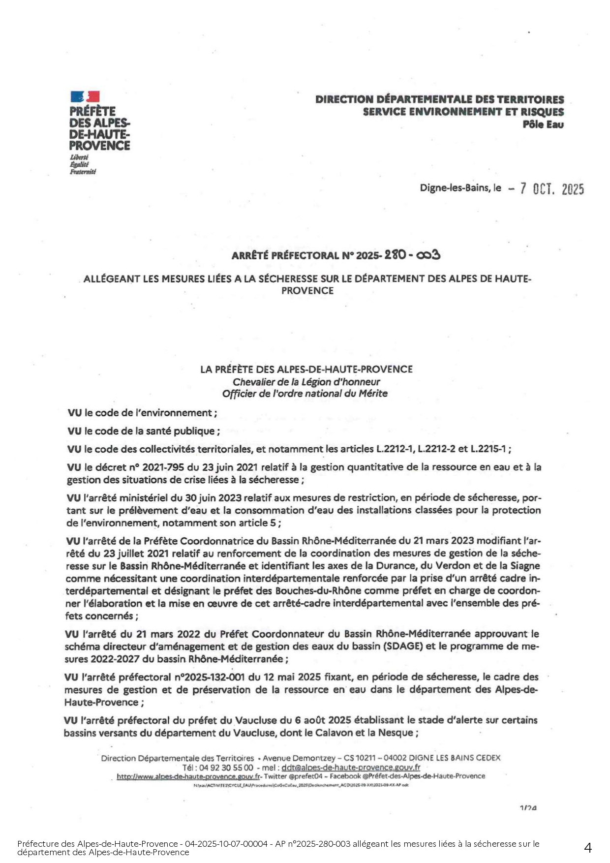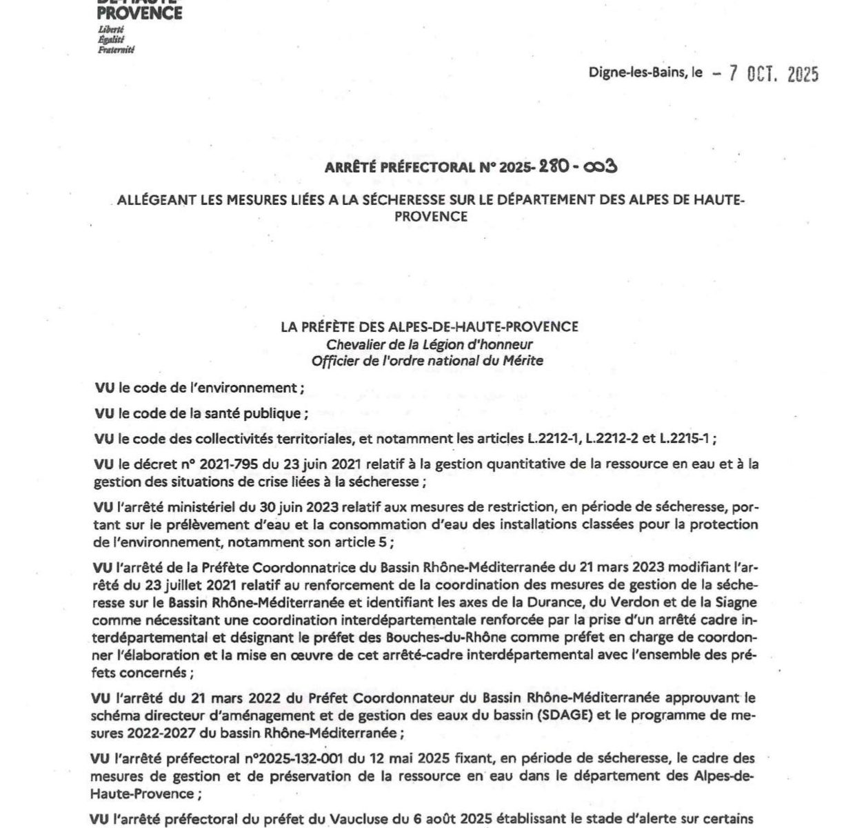 ARRÊTÉ PRÉFECTORAL ALLÉGEANT LES MESURES LIÉES A LA SÉCHERESSE SUR LE DEPARTEMENT DES ALPES DE HAUTE-PROVENCE